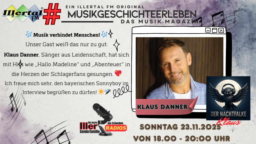 Freu dich auf ein besonderes musikalisches Highlight am 23.11.2025, von 18:00 bis 20:00 Uhr, im Musikalischen Rendezvous bei Klaus dem Nachtfalken auf illertalFM – #Musikgeschichteerleben!