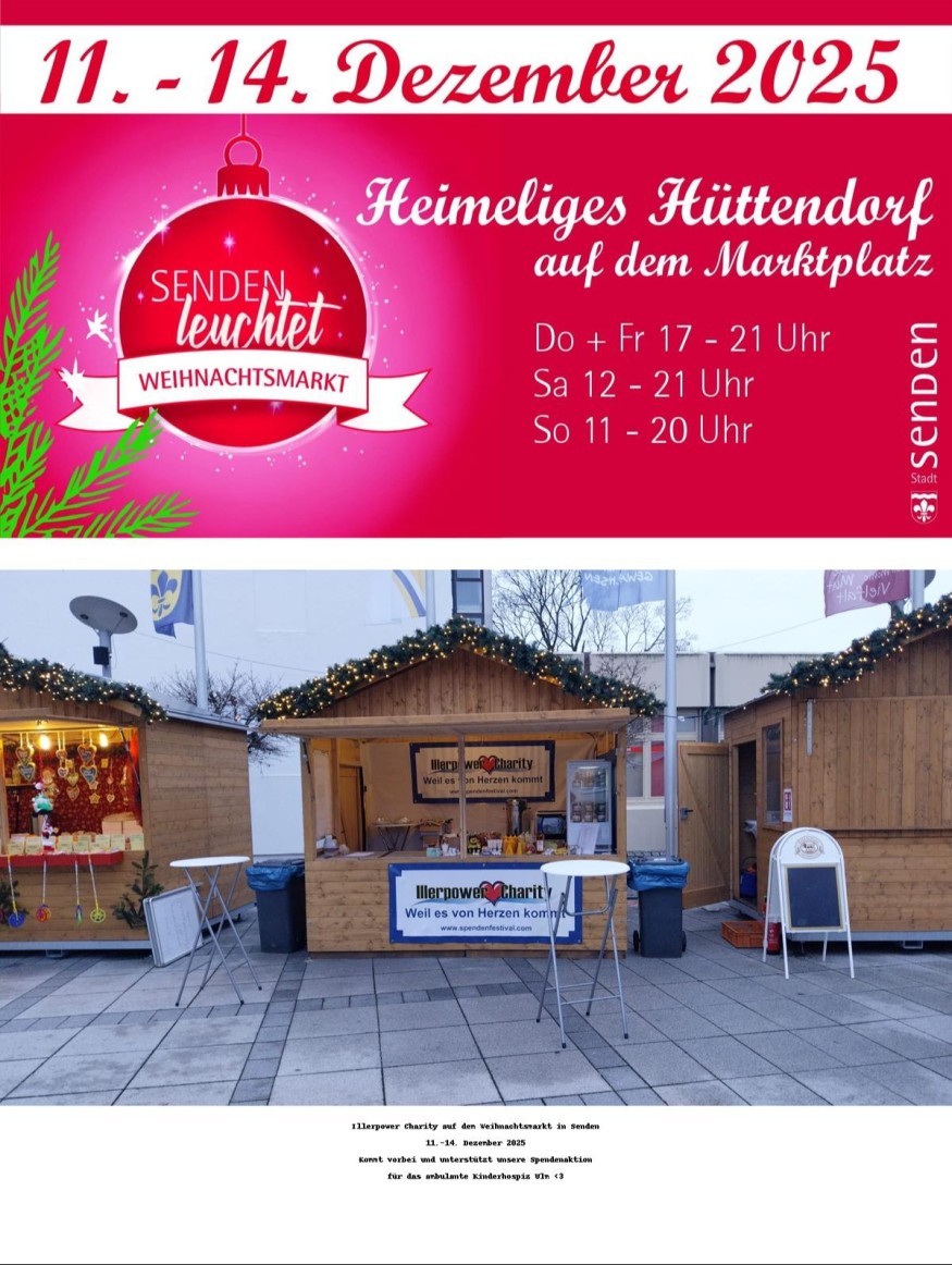 Dieses Wochenende sind wir wieder mit Illerpower Charity auf dem Weihnachtsmarkt auf dem Marktplatz in Senden für euch da – festlich, herzlich und wie immer mit ganz viel Liebe zur Region.